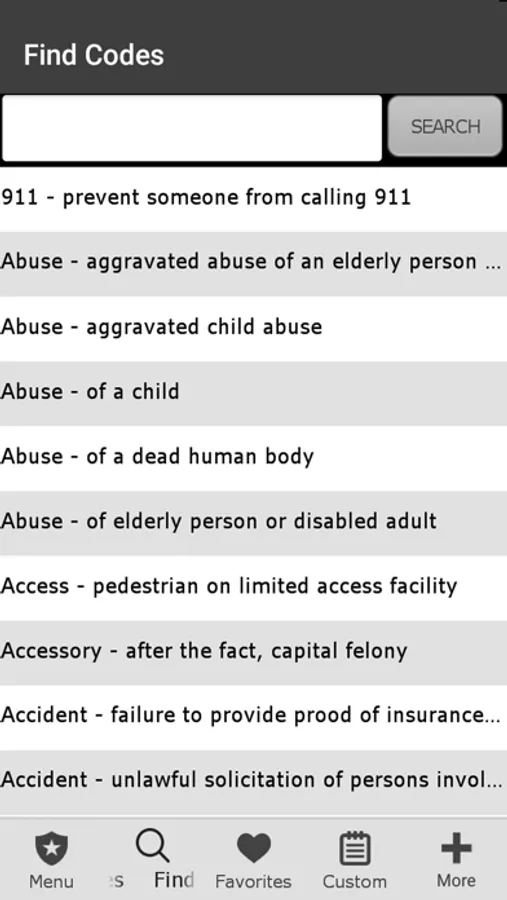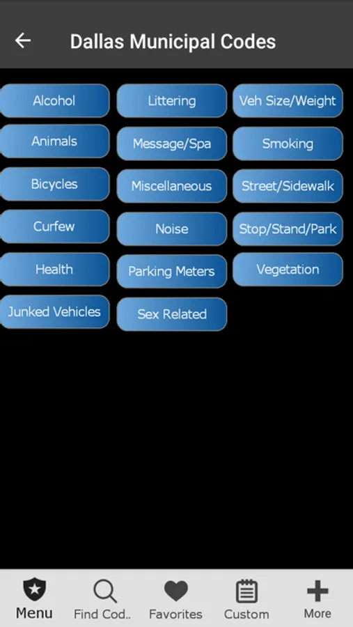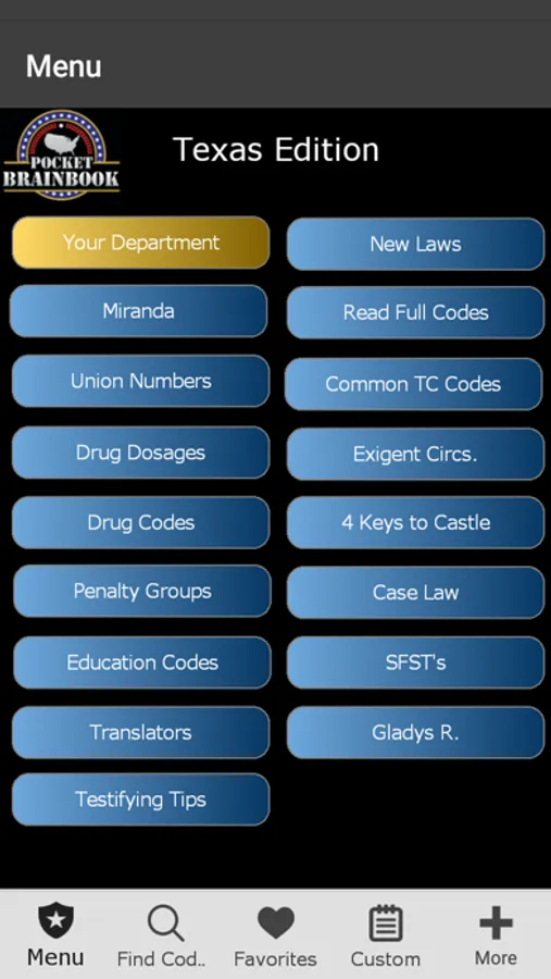Designed for Texas Police. This app was designed based on our popular pocket book version currently sold in TX police stores. You can search Penal, Traffic, ABC, Health and Safety Laws by keyword or browse Codes. It has Miranda, narcotic codes, Drug symptomology domestic violence codes, translator cheat sheets for 6 different languages, vehicle theft info, and so much more. We have also included a custom section to add your own department information (ie. Municipal codes, radio codes, policies, etc.) This app can also be customized to your specific Police Department.