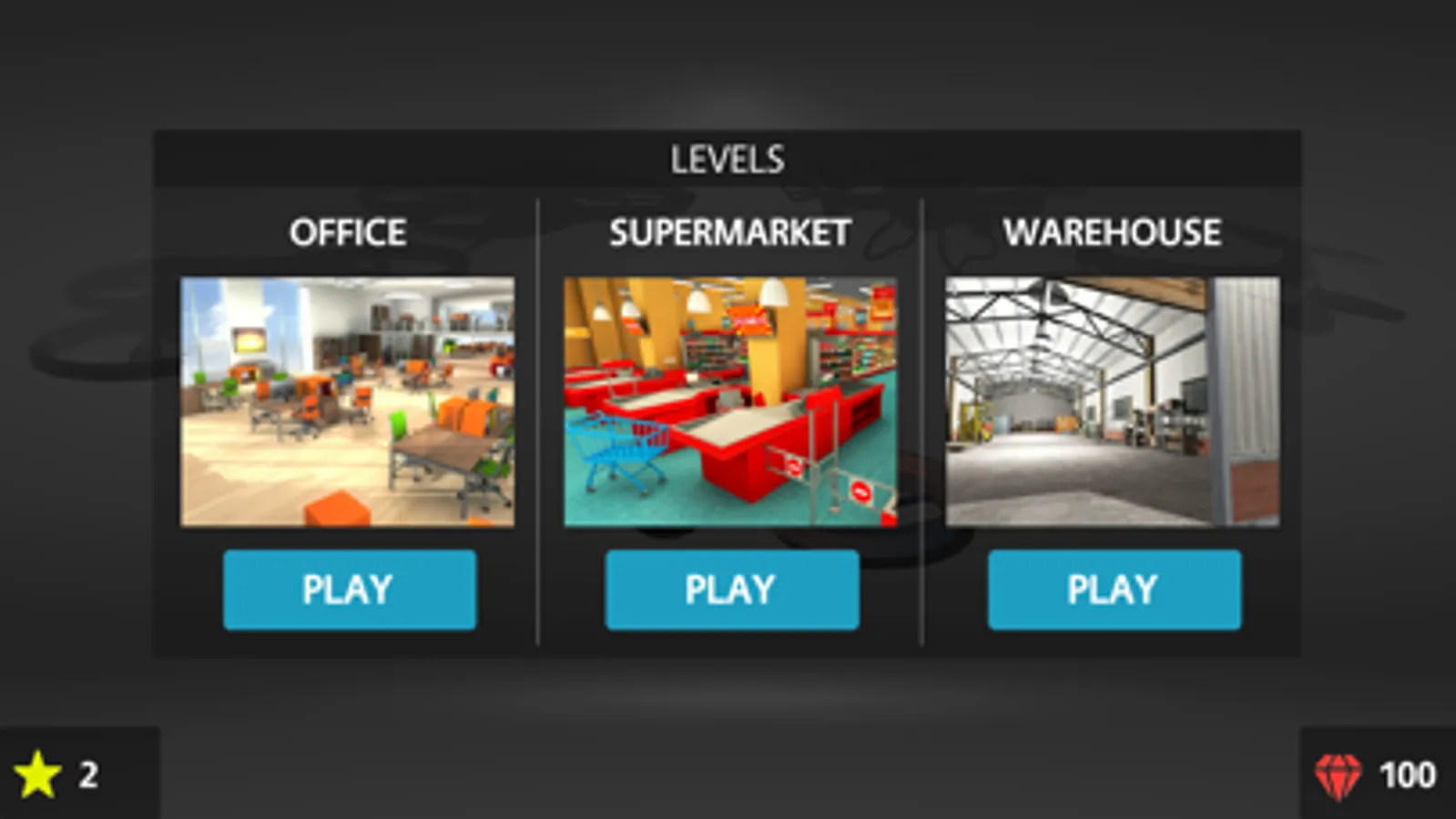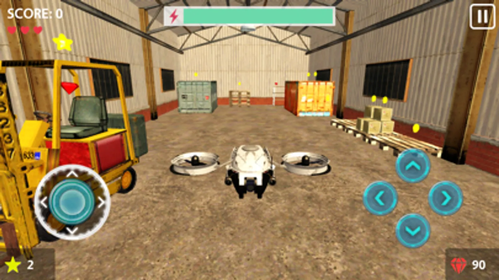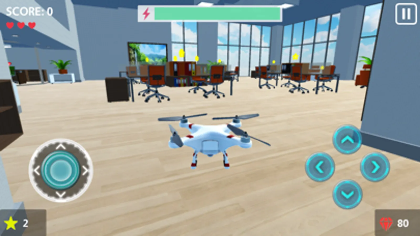 Fly remote controlled drones and collect stars at three different places: Office, Supermarket and Warehouse.