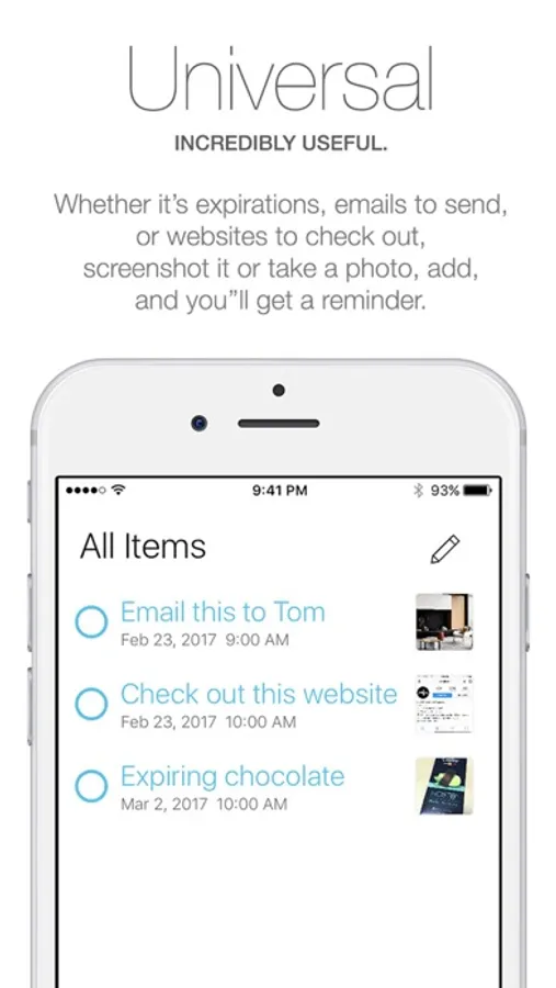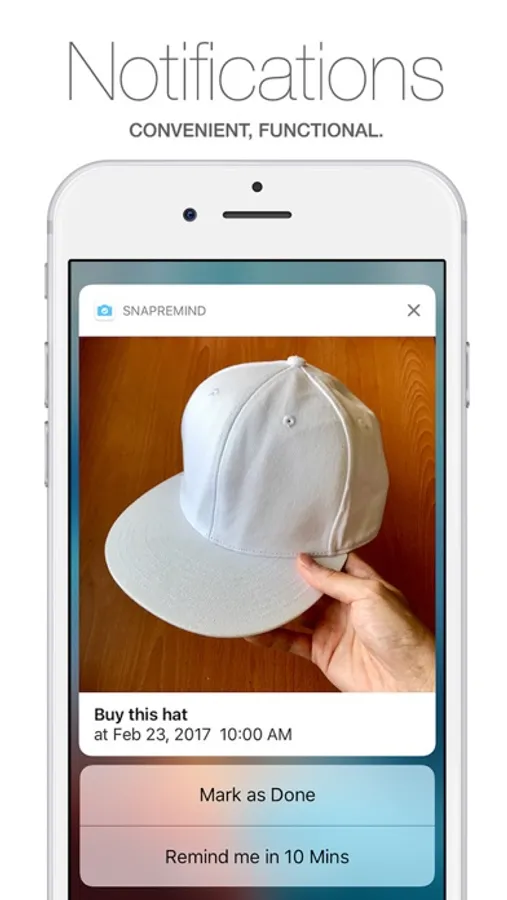 Integrated with iOS 10 notifications, your screenshots and photo reminders show up when you need them. Upon receiving a notification, you can check it off right away or tell the app to remind you later without needing to open the app.