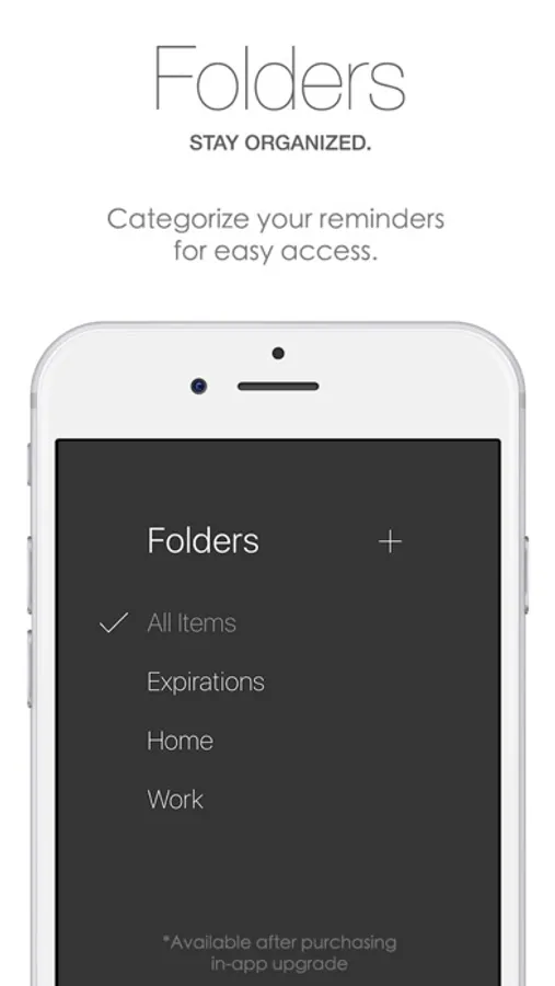 Group your reminders for easy access. Have a folder for expirations, work, home, school, shopping, etc. (Available after purchasing in-app upgrade)