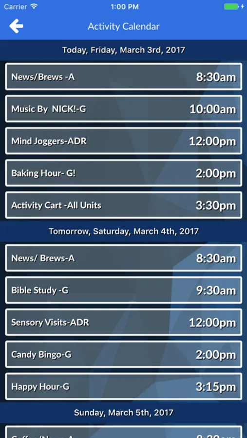 - Activity Calendar, featuring the list of upcoming activities planned by the activity director, broken down by date and time.