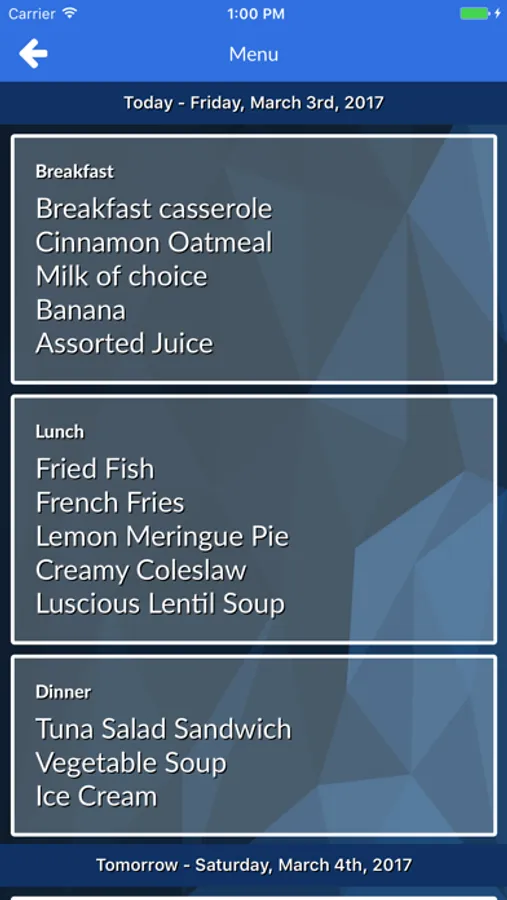 - Menu Plan / Meal Calendar, featuring what will be served from the kitchen each day of the week.