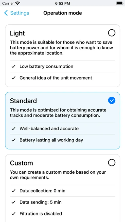 The application supports choosing a user mode from pre-set ones or creating your own with settings depending on the goals of monitoring. A wide range of settings available allows receiving accurate data while reducing traffic and battery consumption.