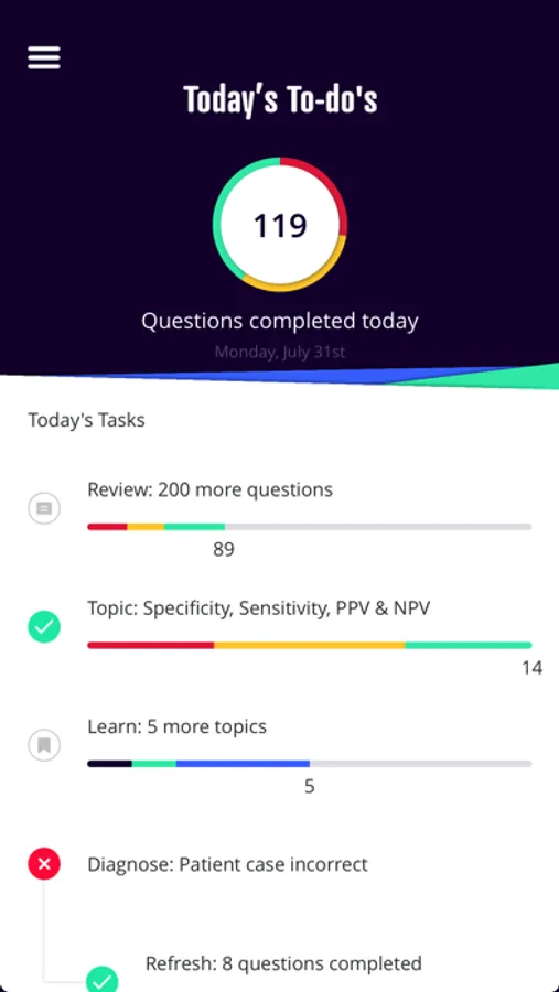 The SGU Clerkship app is intended to act as a companion to the core Firecracker desktop experiences. Your clerkship daily review tasks will appear in the mobile app each day, and you can create additional 'Get Ahead' tasks if you'd like to continue burning through your stack of high priority questions. You will also be able to solve your daily diagnostic case and complete your weekly tests and course exams.