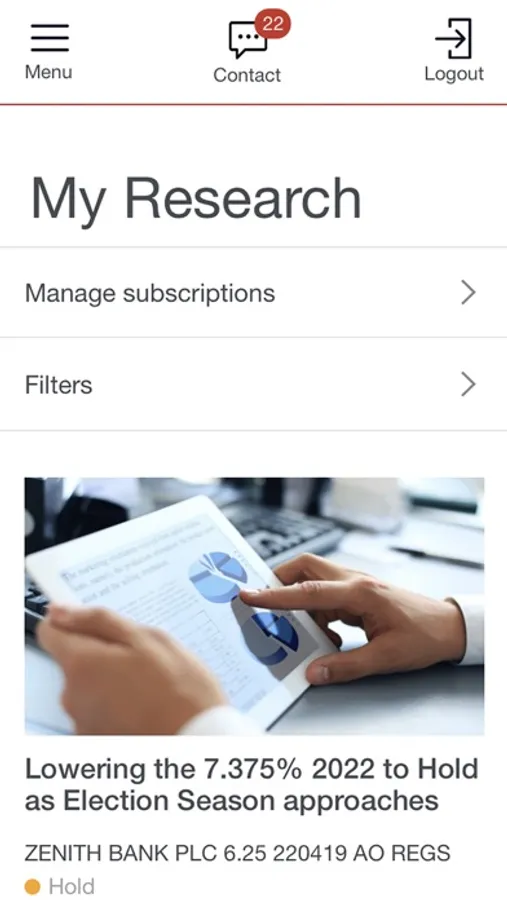 The convenience of banking at your fingertips via Digital Services Access your Bank of Singapore portfolio information - browse through your holdings, investments and historical transactions - anytime, anywhere. Stay on top of market movements by subscribing to research related to your holdings that are curated based on your preferences. Go green by viewing and downloading your e-Statements and the digital copies of your transactions and contract notes. Collaborate with us by sharing and annotating documents on the go and conducting audio and video calls with your Relationship Manager and Investment Counsellor. To be eligible to access this app, you need to have a Private Banking account booked in Singapore or Hong Kong. To register, please contact your Relationship Manager. Eligibility for Digital Services access and features would depend on your country of residence or incorporation. Terms & conditions apply.