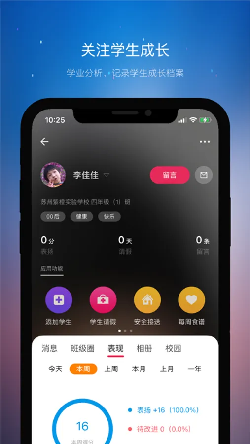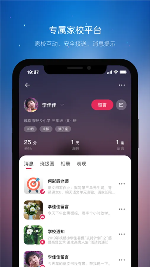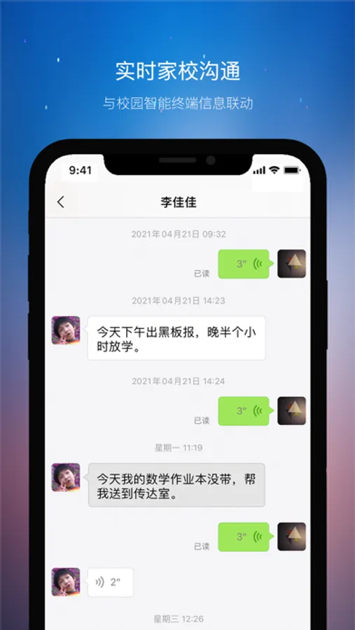 智慧校园平台配套的家长端APP,家长可以及时了解自己孩子在学校的情况,以及实现家长、老师、学校间的互动,为配套电子班牌特别设计的视频通话功能,让在校学生更便利的实现双向家校联系。