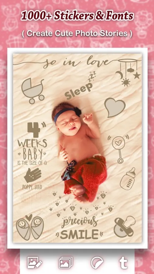 Beautify your baby pics with tons of cute Artwork - stickers and Texts.
