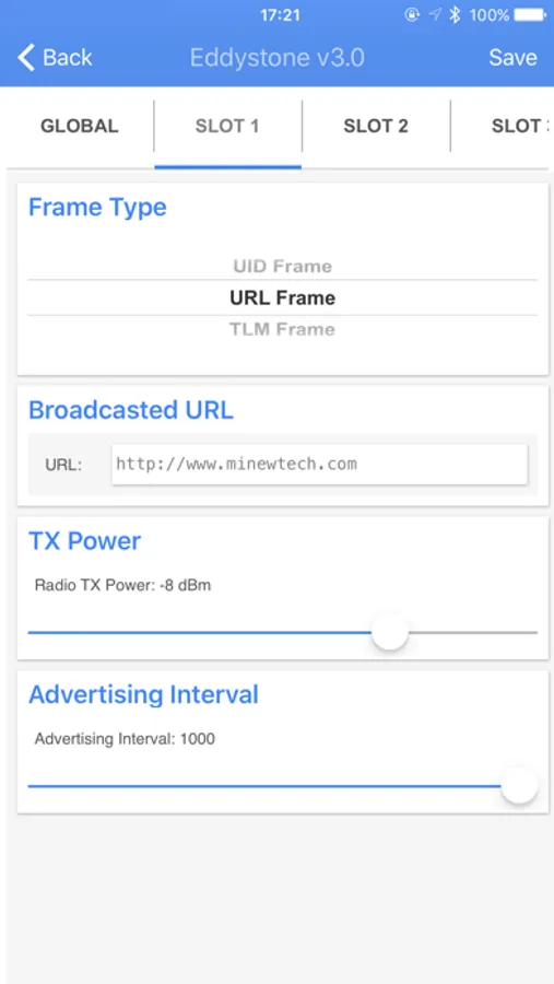 -Configure Eddystone’s parameters, such like UID, Url, transmit power, broadcast interval etc.