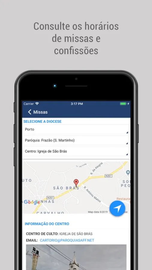 Pesquisa, por Diocese/Paróquia/Locais de Culto onde são apresentados os horários e localização, das missas que se realizam diariamente, bem como os contactos de telefone, email e website
