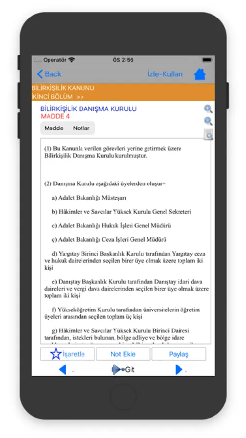 1-Yıldız işaretine basarak Kanun maddesini işaretleyip İşaretlediklerim menüsünden hızlıca ulaşabilirsiniz.
