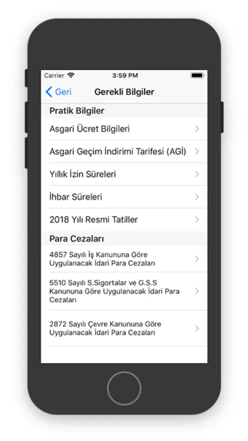 Uygulama içerisinde İş ve Sosyal Güvenlik ile ilgili mevzuat, kanun maddeleri ile ilgili içtihatlar da yer almaktadır. Sıkça Sorulan Sorular ve Gerekli bilgiler bölümlerinde para cezaları, Asgari ücret, ihbar süreleri vb. bulunmaktadır.