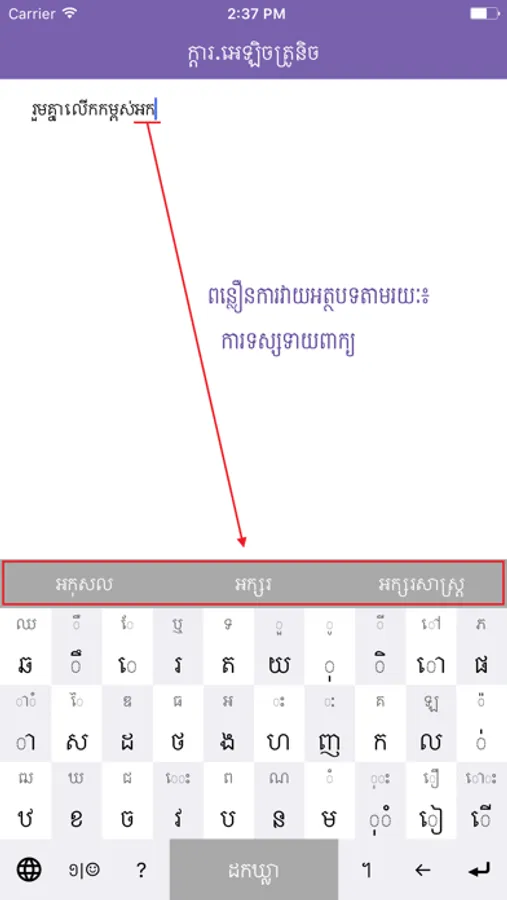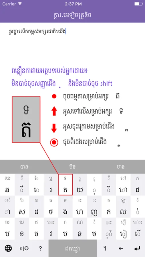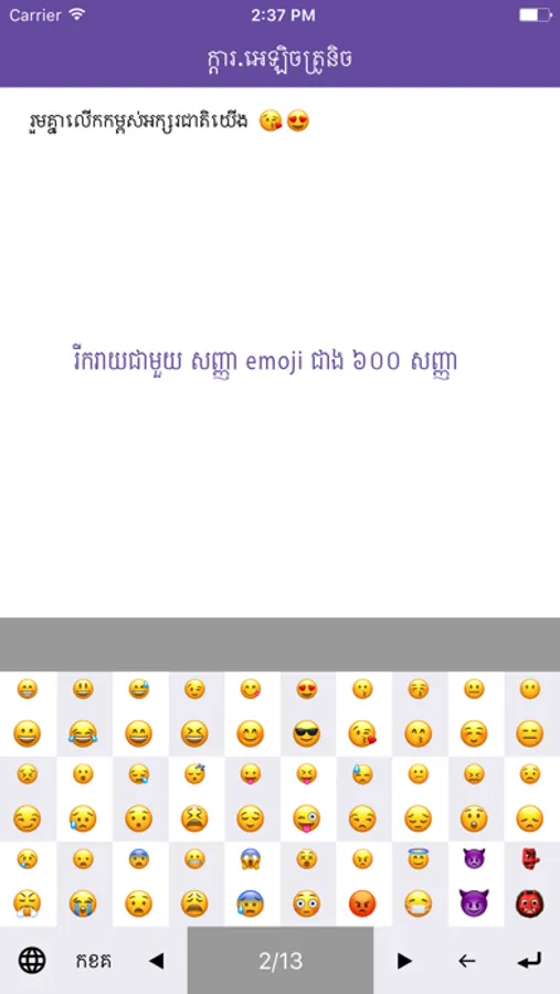 Khmer eKeyboard is an application which helps users to type Khmer text more easier and faster on their smart phone and tablet. The application is designed in the purpose of increasing the use of Khmer text in any areas especially in social network context like Facebook.