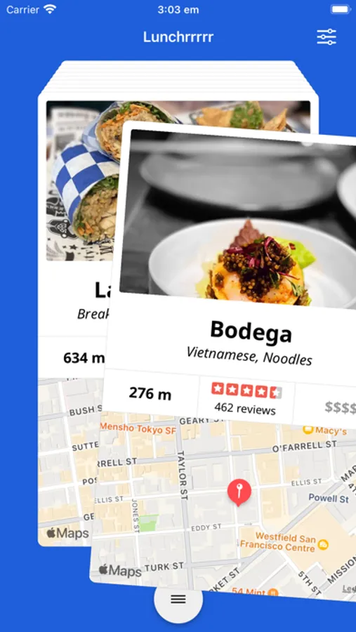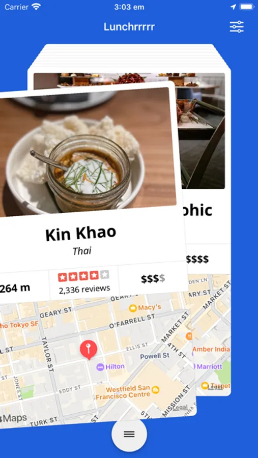 Swipe left to show more places. Swipe right or tap a card to show more information. It's like a famous dating app, but for people and restaurants!
