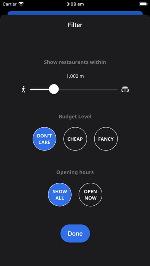 You can filter restaurants by setting a maximum distance and adjusting for budget and opening hours.