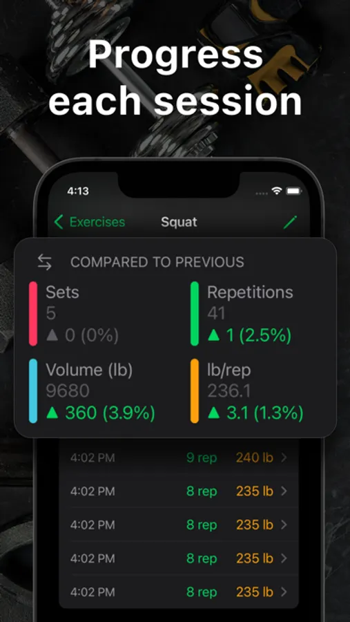 For any exercise, you can quickly access past sets. This way, you can easily set your targets for the session.
