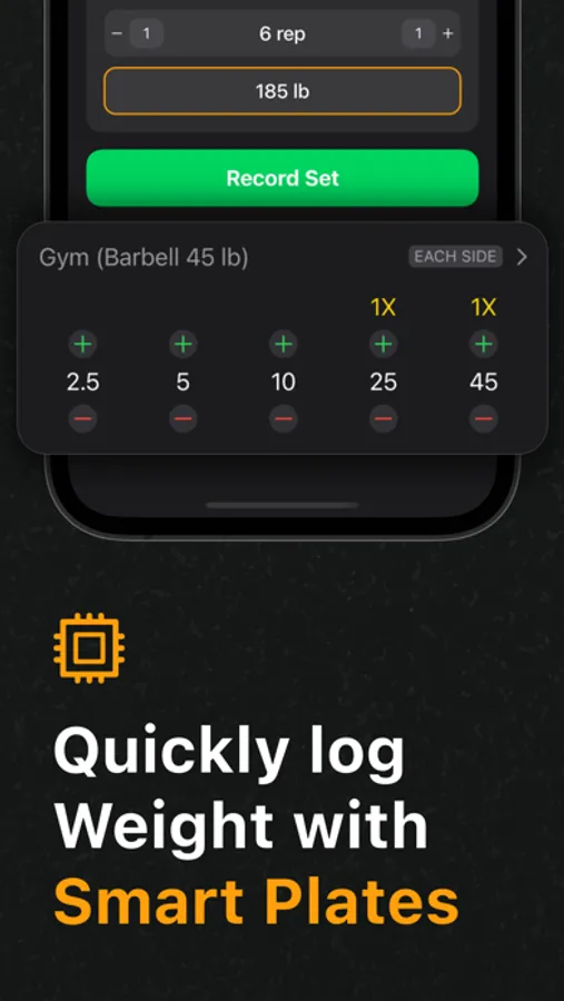 Setgraph wants you to spend as little time as possible on your phone. All your focus should be on the weights. With that in mind, we built Smart Plates. It automatically fills in the weight for you based on your plates. No more doing math in your head.