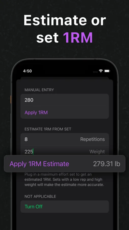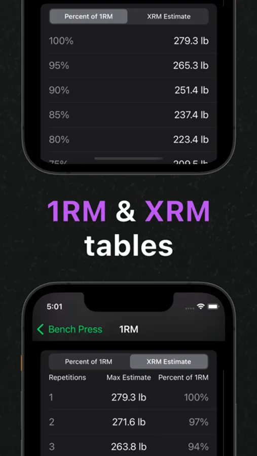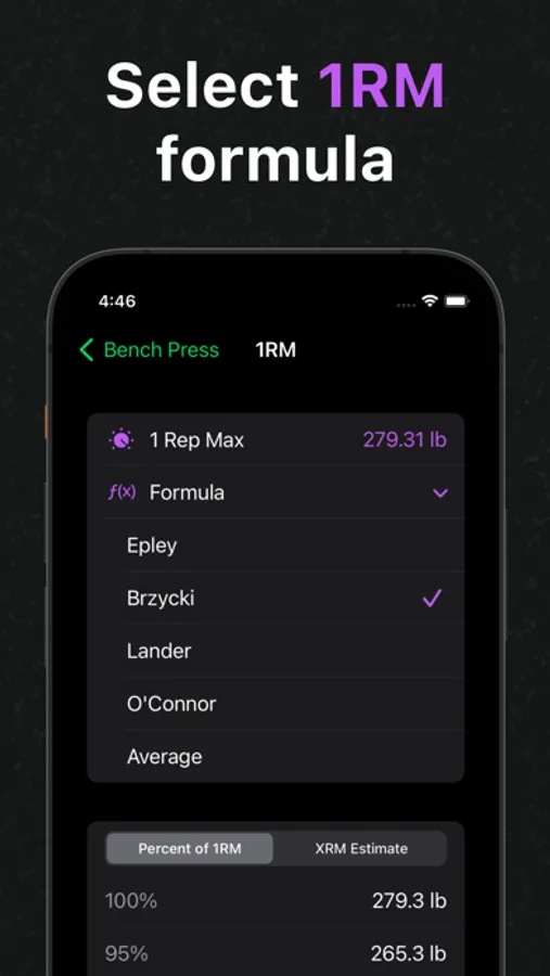Quickly view the estimated maximum weight for any rep amount. Plus, users can choose their 1RM formula.