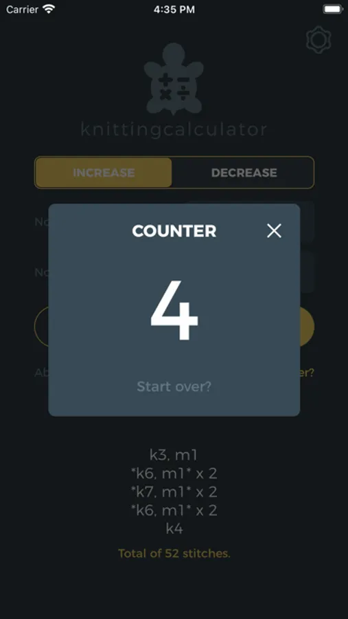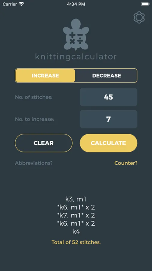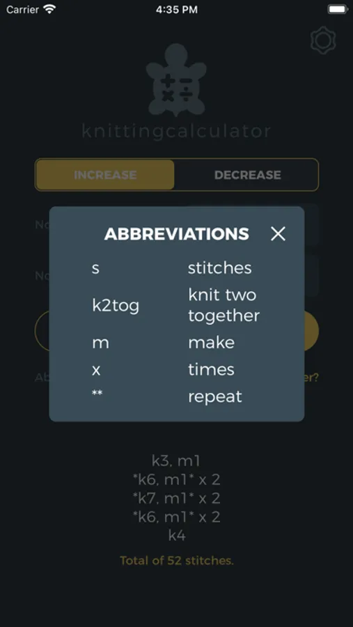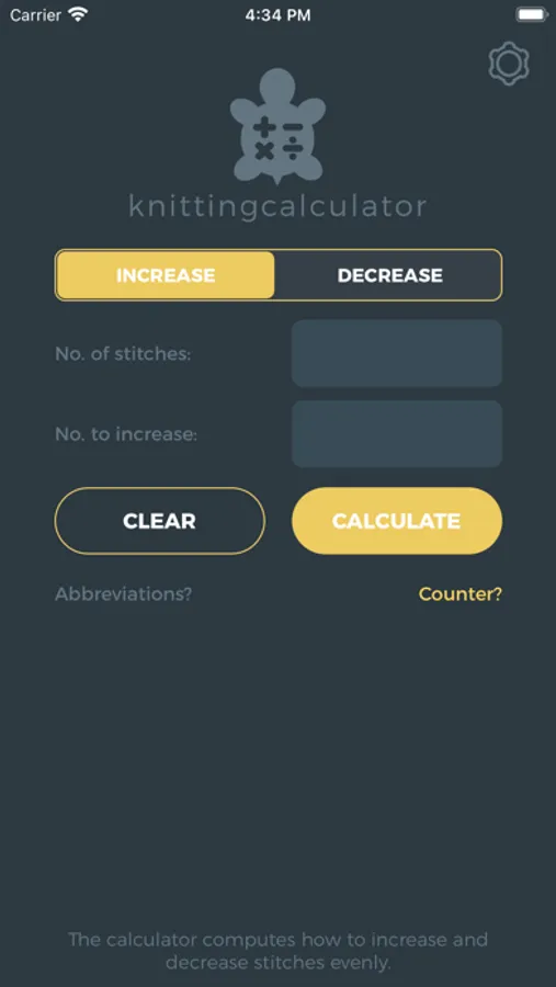 The knitting calculator computes how to increase and decrease stitches evenly. The app is responsive, simple and intuitive, and also contains a list of abbreviations and a counter.