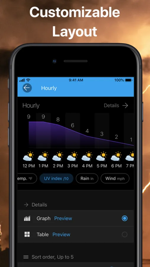 - Sort order: You can change the priority of weather type like Temperature, Rain, Wind, Wind gust, Pressure, UV index.