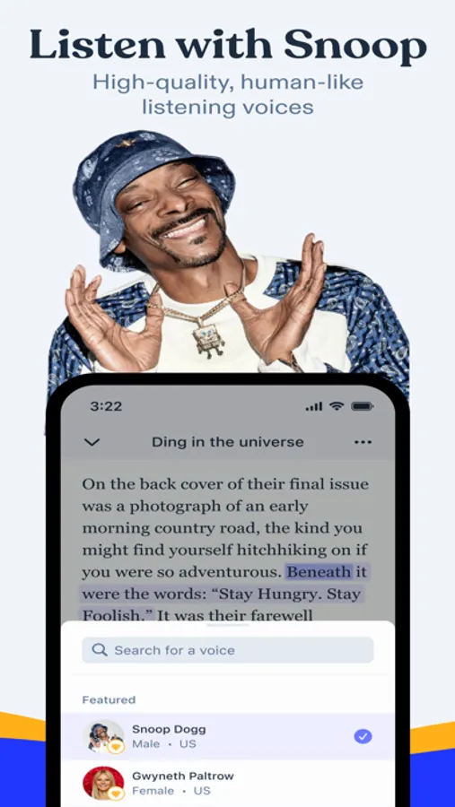"Speechify lets me listen to Goop blog posts out loud in the car and gets my friends through grad school. It's amazing for scripts."