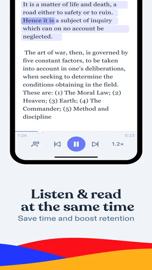 The text is highlighted and perfectly synced, word for word, with the voice reader to help you read along. Reading & listening helps you retain more.