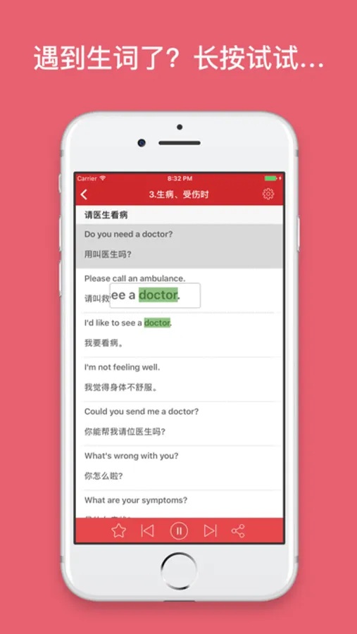 《英语口语8000句完美版》全文定位点读, 同步高亮显示. 长按任意单词即弹出词典, 同时可将单词加入生词列表. 不需要进度条式的拖拽, 没有查字典的繁琐. 最新支持耳机线控操作, 使用更加轻松便捷.