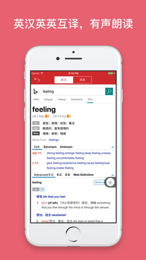 《英语口语8000句完美版》的每个句子都有标准的真人读音, 英汉对照, 即点即读. 文中每个英文单词都有详细的解释, 音标, 发音以及例句用法, 在阅读的时候只需在任意单词上长按超过一秒钟, 即可查阅, 即点即译, 真正做到哪里不懂点哪里.