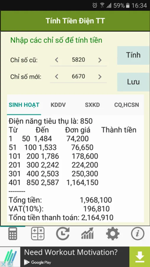 Chương trình tính tiền điện dựa trên chỉ số cũ và mới của công tơ điện với mức giá điện mới nhất được áp dụng trên toàn quốc.