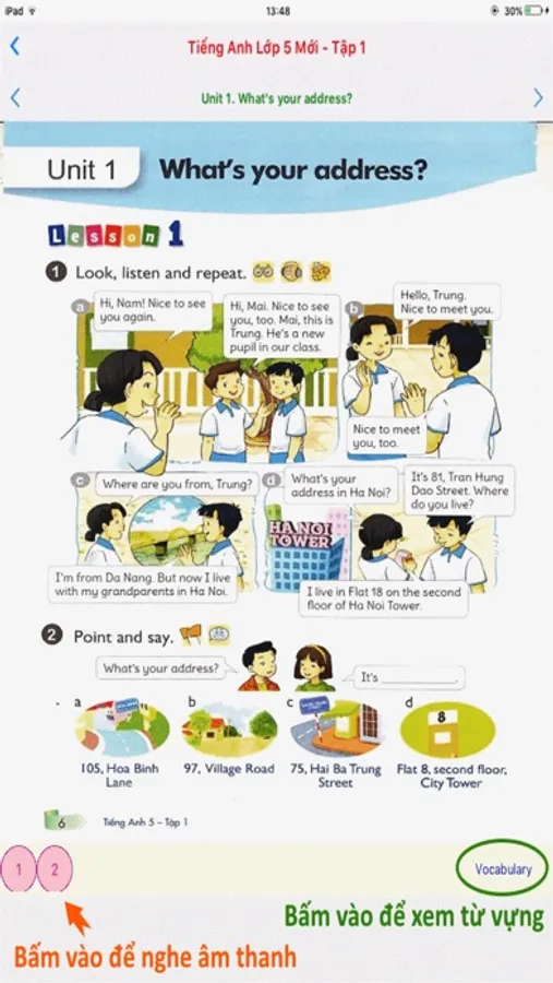- Bấm vào các số bên dưới trang sách bạn sẽ nghe được nội dung của bài học đó.