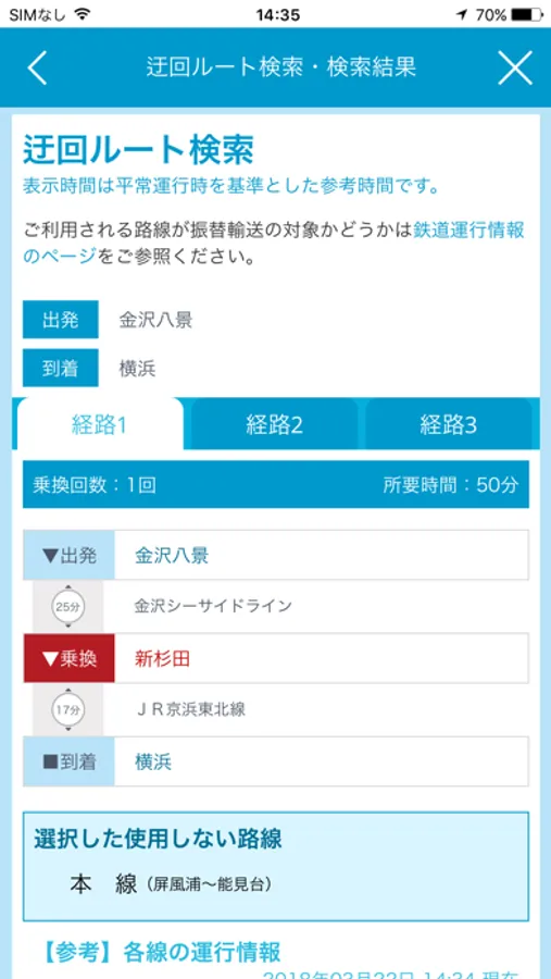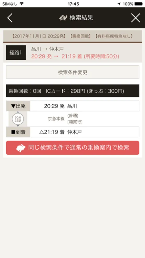 通常の到着時刻の早さや乗換回数の少なさを重視した乗換案内です。