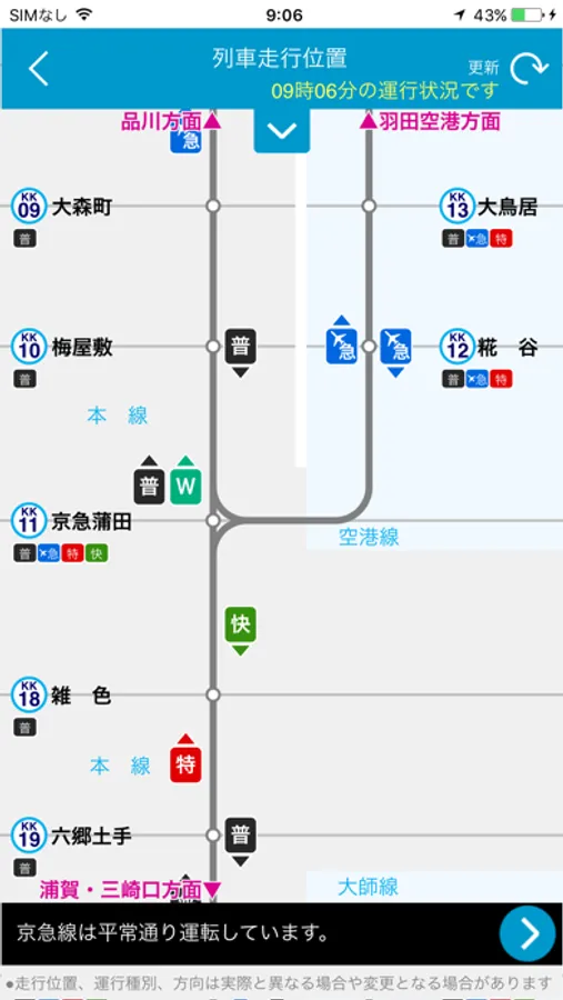 京急各路線に走行している列車の位置,運行種別,進行方向がご確認いただけます。
