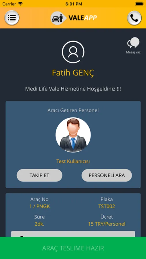Uygulama ile aracınızı parka alan ve getiren personele istediğinizde istediğinizde telefon ile ulaşabilirsiniz.
