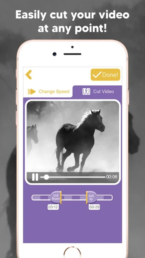 Easily highlight those special moments by changing the speed of the most important parts. Apply speed variations to any sections of your video. Determine when the slow motion or fast motion effect starts and when it ends. Easily control the speed of all your videos. Try out the fastest and easiest way to trim videos, slow down or speed them up. Make your videos look awesome on all social networks!