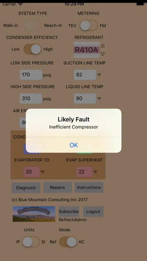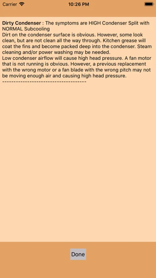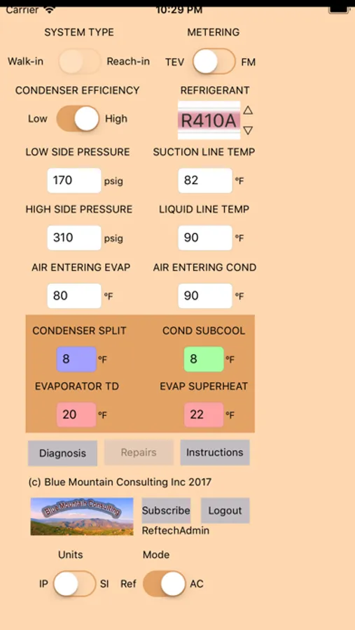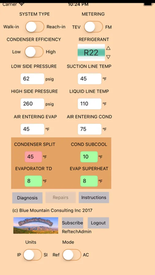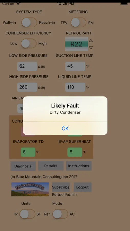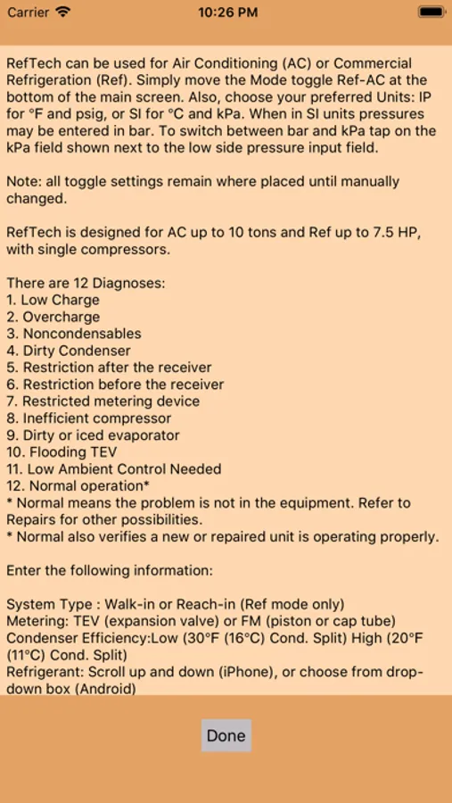 Disclaimer: This app is designed as a diagnostic aid to supplement observations of refrigeration system operation. It in no way warrants or guarantees the diagnosis is absolutely correct. The user accepts all responsibility as to the accuracy and validity of the repairs the user employs.