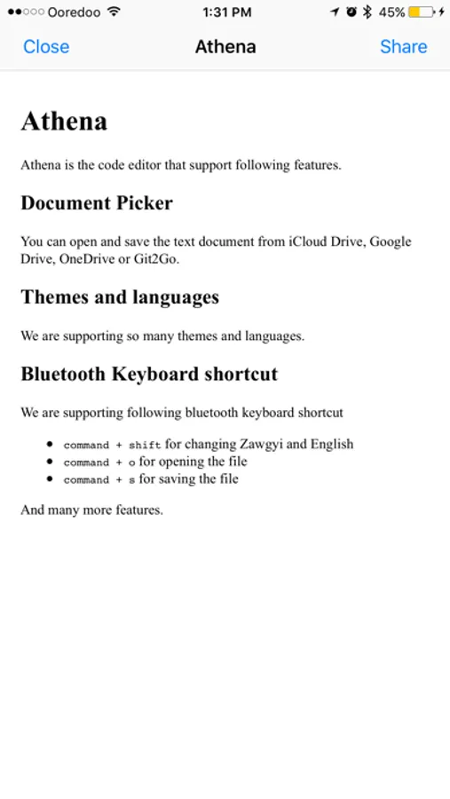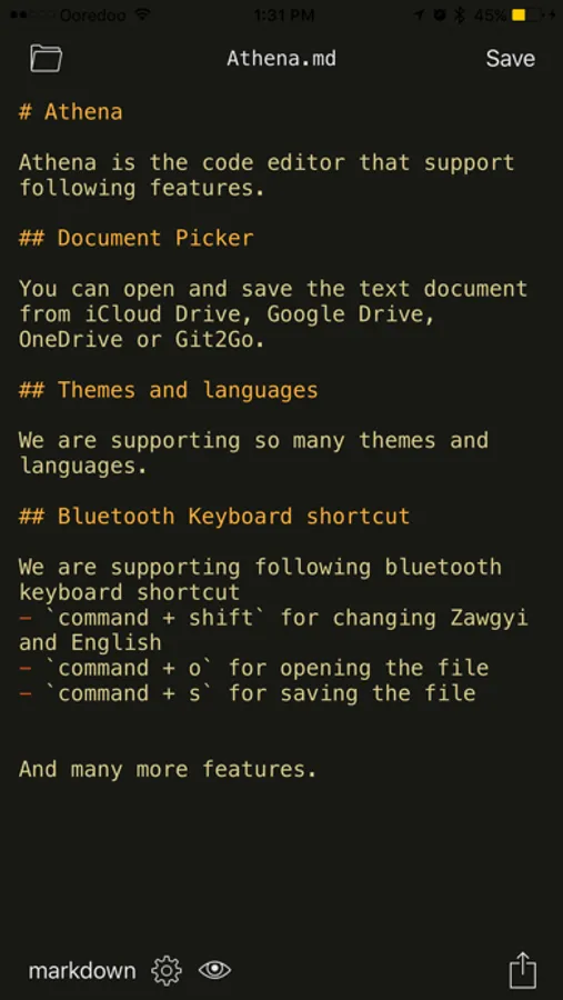 Special feature for Myanmar people is "SUPPORTING BLUETOOTH KEYBOARD". Yes, you can type with Zawgyi in Athena Editor. Using Control + Shift to change the keyboard.