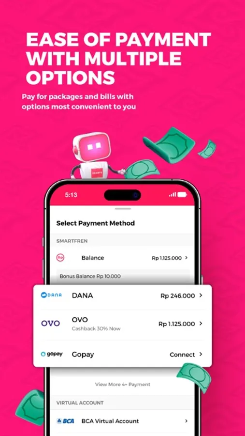 IV. Peace of mind with secure real-time payments. Enjoy multiple payment options from your balance, Simobi+, Sinarmas VA, DANA, OVO, GoPay, ShopeePay, LinkAja, BCA VA, Permata VA, Rekening Ponsel, OCTO Click, OCTO Mobile from CIMB, & credit/debit cards.