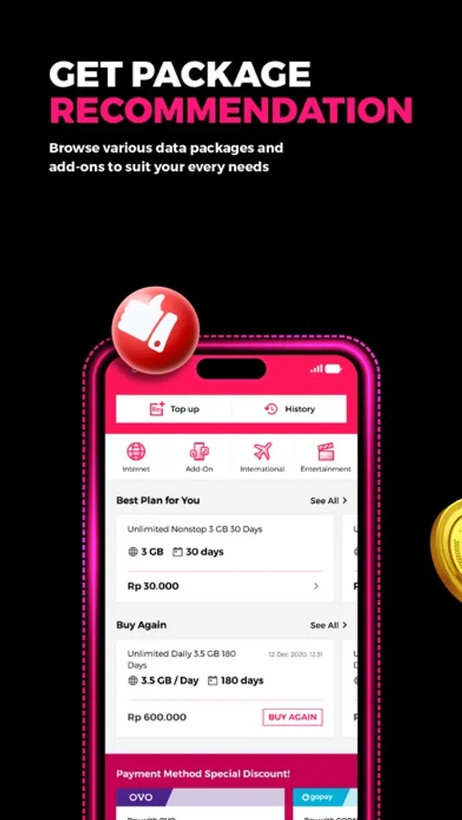 I. Easily check balance, top up, scan voucher data, or buy data packages. Also get recommendations that suit your needs.