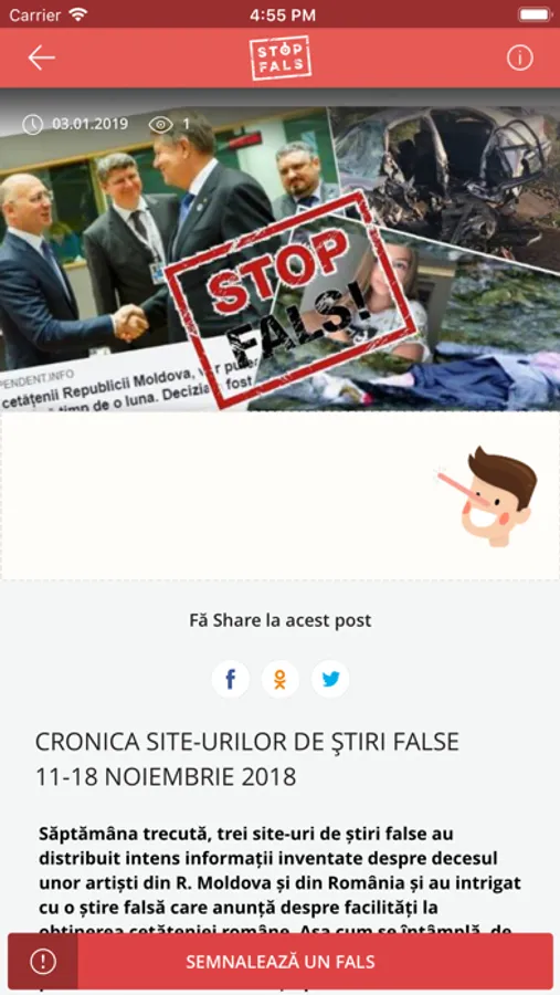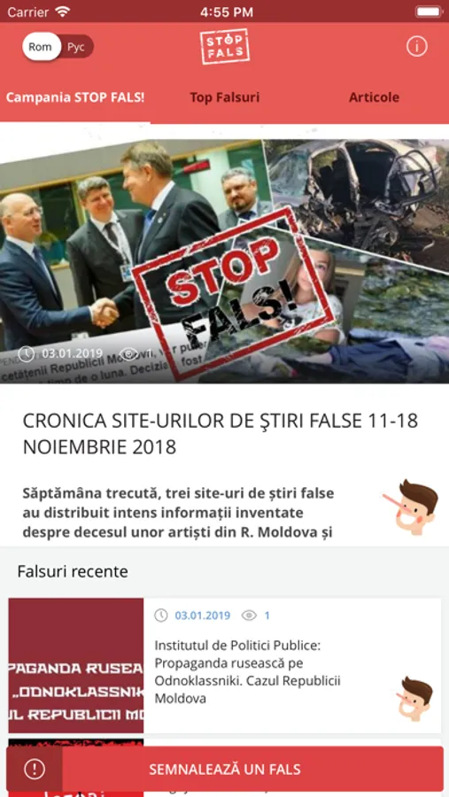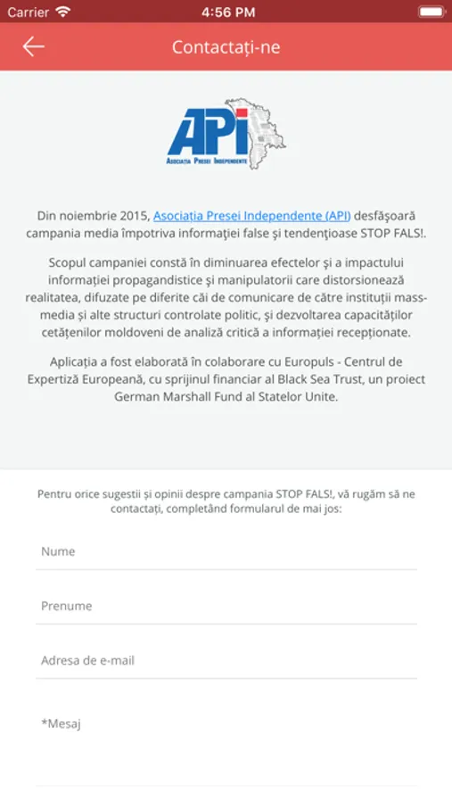 Aplicația StopFals.md face parte din campania împotriva informației false și tendențioase STOP FALS!, desfășurată de Asociația Presei Independente (API). Acest App pune la dispoziția utilizatorului un mecanism de alertă, care trimite notificări privind un nou fals apărut în presă, cât și dezmințirea acestuia. La nivel vizual, aplicația folosește diverse instrumente (GIF-uri, MEME-uri, caricaturi) care combină umorul cu dezmințirea informațiilor false, astfel oferind un format dinamic și intuitiv utilizatorului. Nu în ultimul rând, un nou feature al aplicației este vizualul Pinocchio, cunoscut personaj din poveste, care „însoțește” toate știrile false și „măsoară”, prin lungimea nasului, gravitatea falsului.