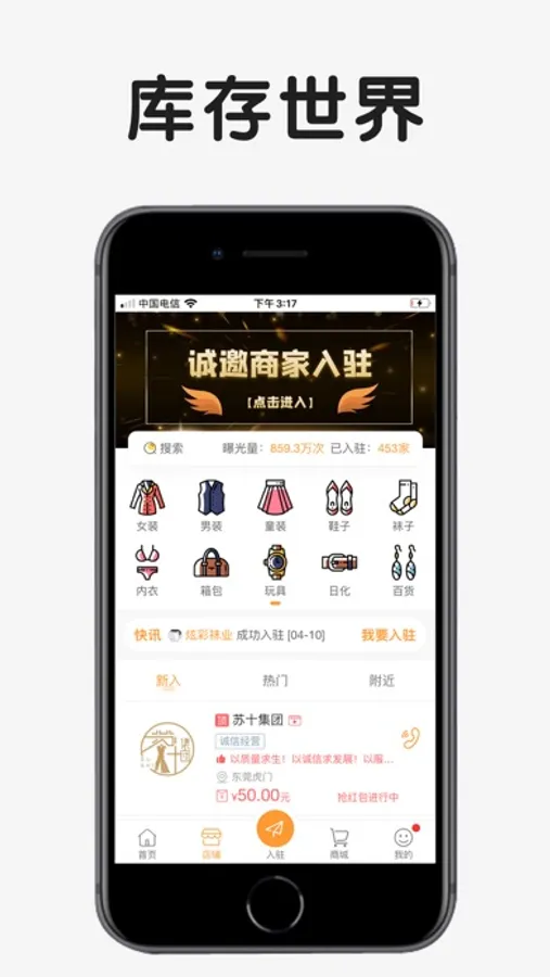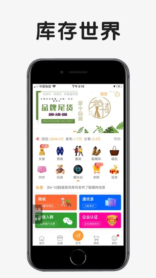 库存世界APP致力于打造中国最具有影响力的库存、尾货交流、交易的B2B2C平台,主要经营范围:库存男装、女装、童装、鞋帽袜、玩具、箱包、百货等。库存世界——世界库存,让中国库存走向世界,让世界了解中国库存!
