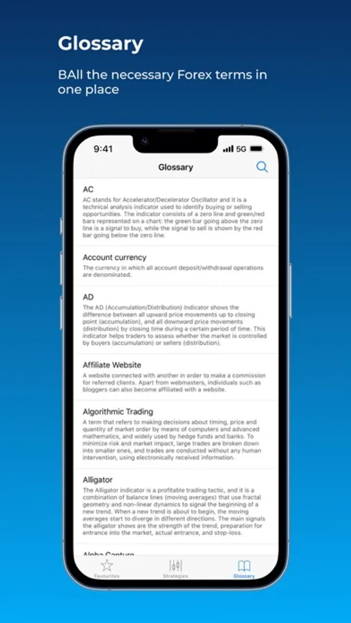 You don't know the name of an indicator or a chart? Our application has a Glossary, which contains clear definitions of all terms used in the FX market.