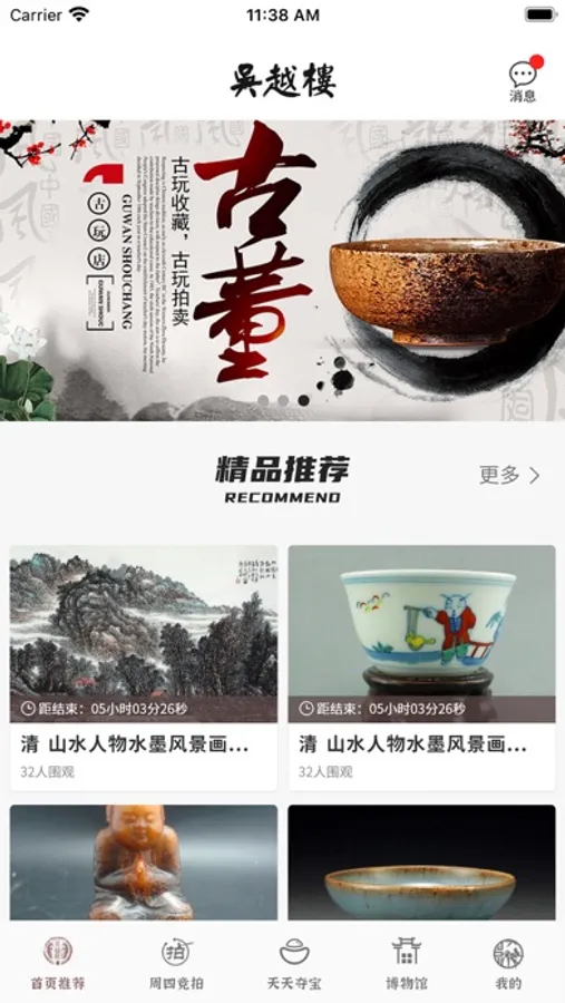 吴越楼APP是一款线上线下结合的购买物品软件,方便用户群体不单单从线下模式购买所需古玩,还可以线上进行实际场景购买,主要面对客户是喜好古玩群体,年龄层40岁以上,针对客户群里制作方便操控的APP软件。整个APP售卖情况根据古玩产品不同价格差异很大,有小到几十的茶具,大到几千上万的瓷花瓶。