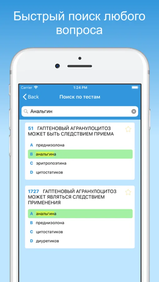 "Поиск по тестам" - раздел для поиска нужного вопроса среди всех предложенных по данной специальности.