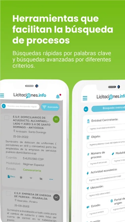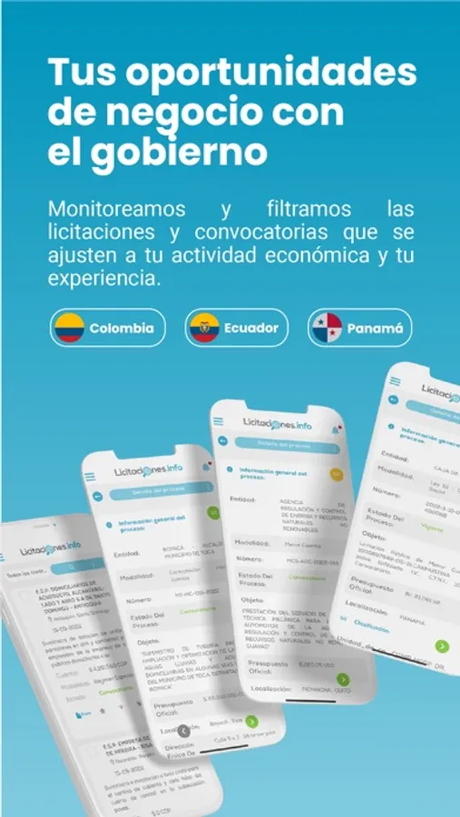 En licitaciones.info S.A.S. buscamos, monitoreamos, centralizamos e informamos de forma filtrada, oportuna, transparente y confiable todos los procesos de contratación que publican las entidades públicas, entidades de economía mixta, organizaciones no gubernamentales nacionales e internacionales y algunas empresas privadas