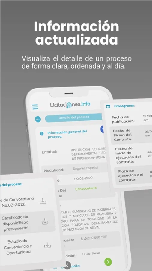 Con la App de licitaciones.info entre otras cosas puedes descargar los documentos de los contratos de tu interés, asignarnos contratos que tengas en la mira para que nosotros le hagamos seguimiento a la publicación de nuevos documentos, puedes organizar tu información en carpetas, crear filtros de negocio para que puedas administrar tu información, activar y desactivar las alertas a tu correo y a tu móvil, crear subcuentas para trabajo colaborativo… en otras palabras, es tu auxiliar personalizable para la consecución y gestión de nuevas oportunidades de negocios.