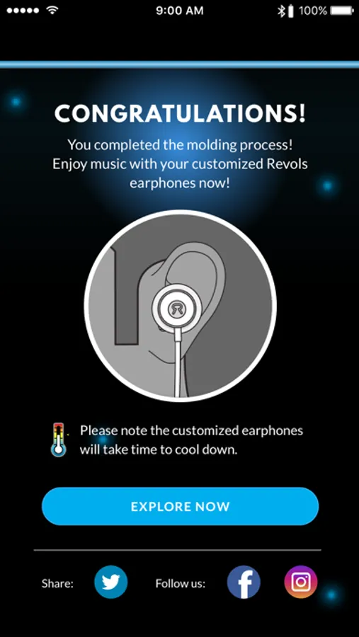 You’re in the driver’s seat! Sync the earphones to your mobile device and have the app guide you through the simple setup process. Once you’re satisfied with the premium fit and sound, hit the start button to trigger the molding magic! In just 60 seconds the earphone tips will conform and harden to the unique shapes of your ears.