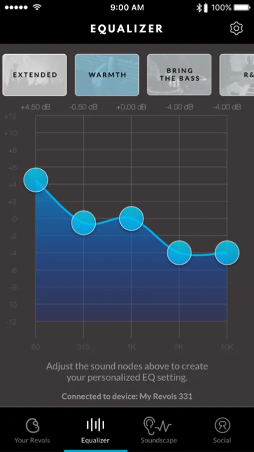 Pushing the boundaries, Revols take customization one step further with the ability to control your EQ settings on the app. By moving the band nodes, you can fine-tune your audio, create and save your own custom sound profile!