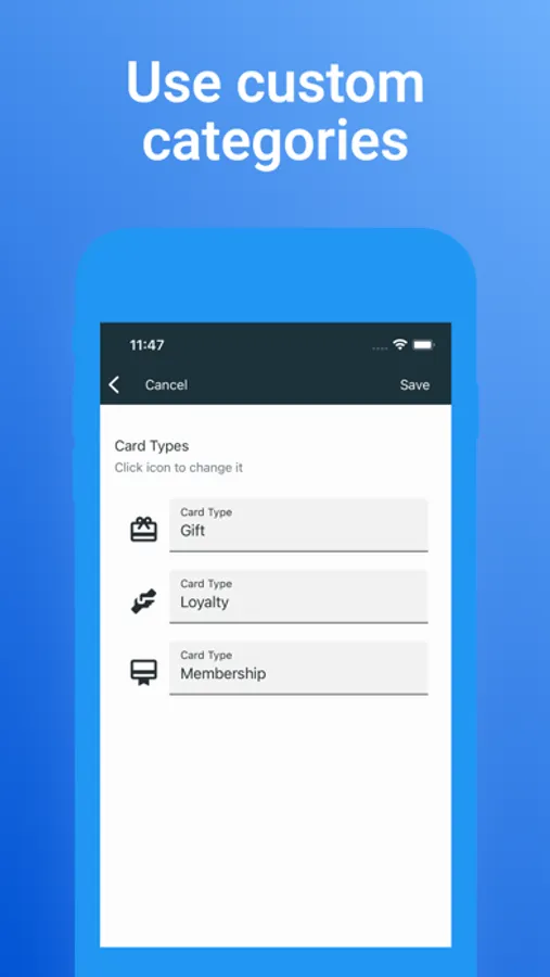 ● Create barcodes and choose barcode types for any existing card, even ones with no barcode!
