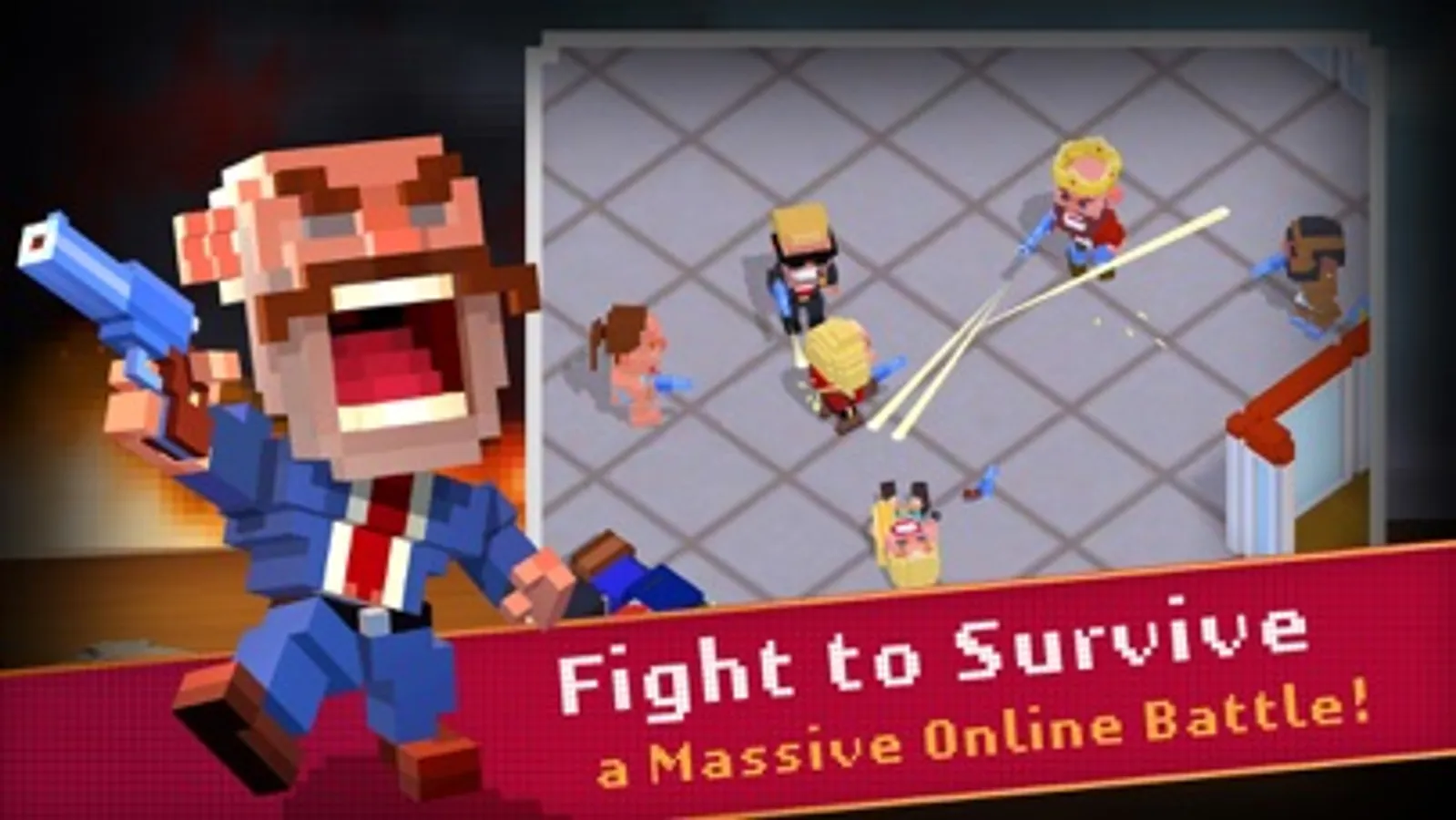 This ain't no rock, paper, scissors! This is gun, gun and bigger gun! As you hit the blocky battlegrounds you must search and collect Experience Points shooting your way through any resistance. Collected experience points will earn you upgrades and perks that can make you king of the hill. Rise to the top of the 'pixel pile' in this battle royale!