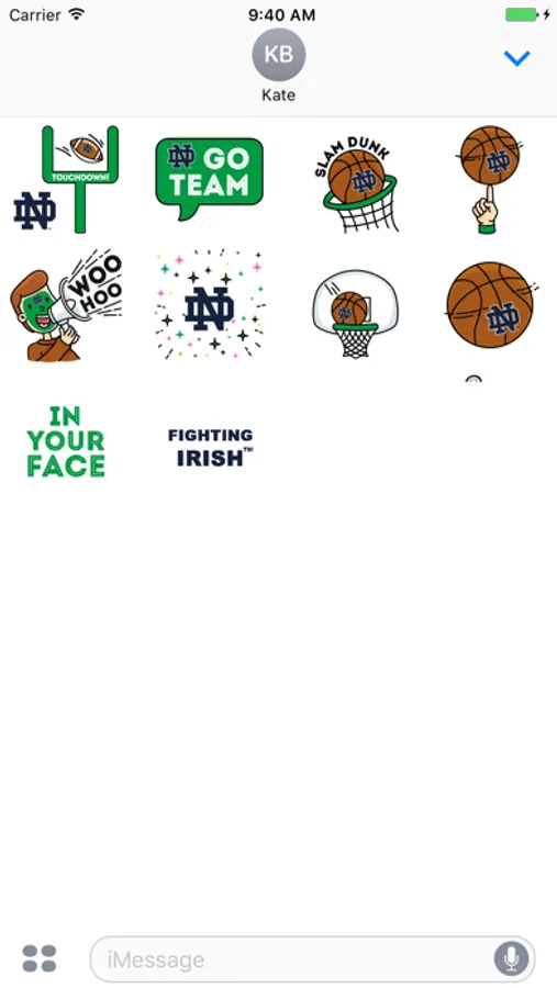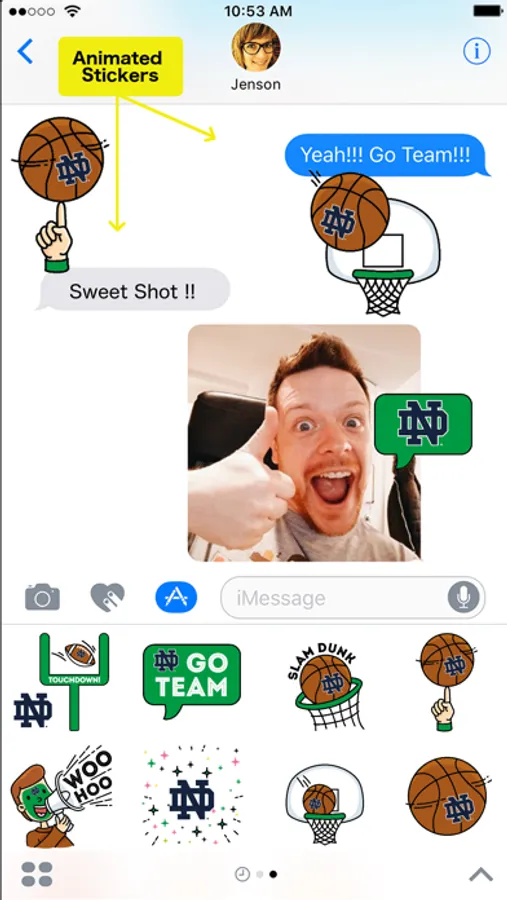 Animate your text and photo messages Fighting Irish style with the Notre Dame Fighting Irish Animated+Stickers for iMessage!! The Notre Dame Fighting Irish Animated+Stickers for iMessage is an officially licensed Animated Sticker Pack from the University of Notre Dame that includes Animated Stickers, Photo Stickers and Static Stickers. The Notre Dame Fighting Irish Animated+Sticker Pack for iMessage includes more and a dozen animated stickers including: Cheering Fan, Touchdown, Defense, Interception, Fireworks, and more. These stickers can be used in iMessage to show your school spirit in text messages and on photos. Just drag them onto your message thread or onto a photo sent through iMessage and they will be shared instantly with whomever you are messaging with. Have fun and Go Irish!!!