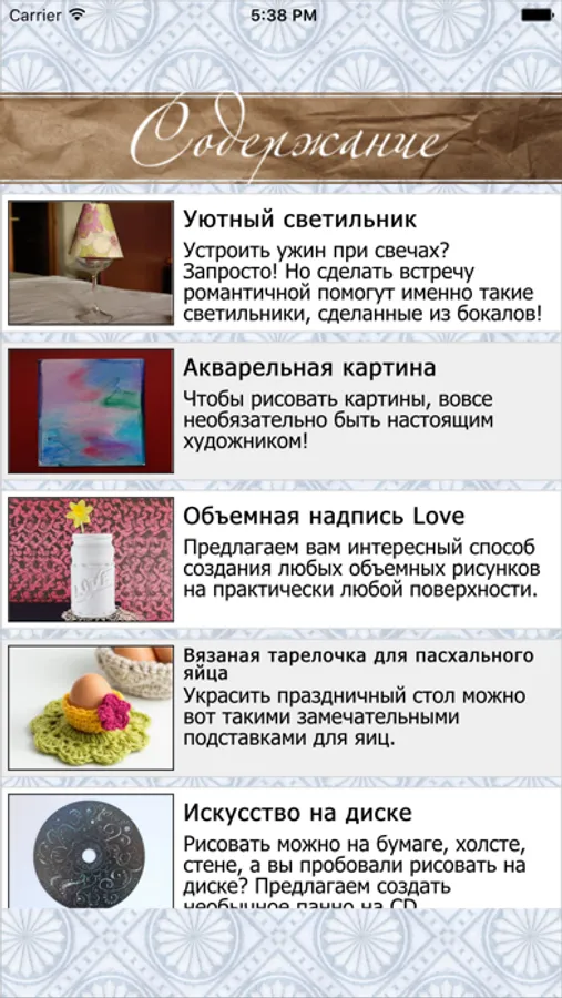 - принцип работы приложения: загрузив на свое мобильное устройство, откройте его. Перед вами появится заставка, нажмите кнопку «Далее» и вы попадете в содержание. Выберите понравившийся вам мастер-класс и нажмите на текст. Начинайте работу! Мы рекомендуем сделать все мастер-классы :)